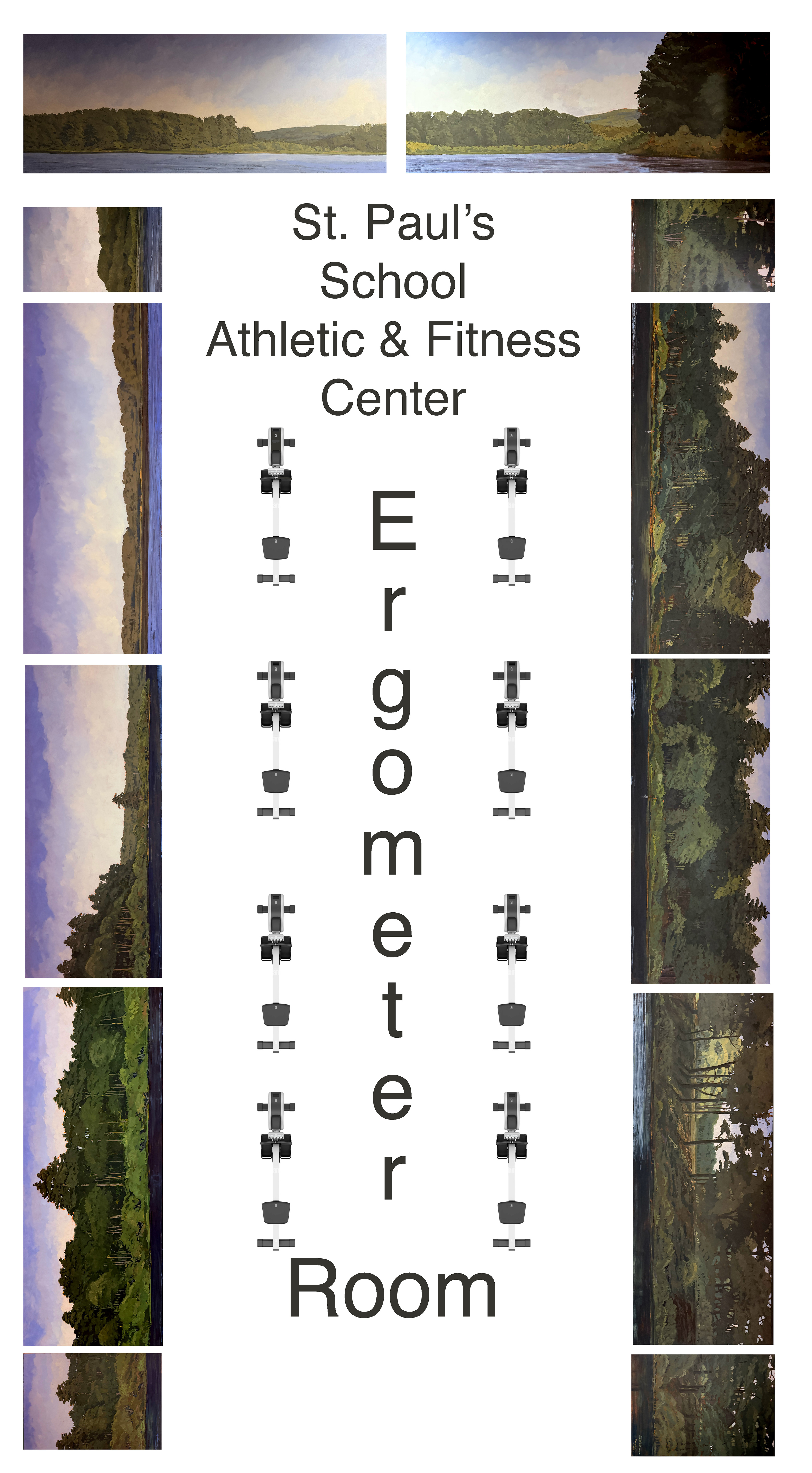 Painted in 2009 for the walls of the Ergometer Room in the Athletic & Fitness Center at St. Paul's School and dedicated to Chip Morgan. The room is approximately 40' x 20' with mirrors on the lower level for rowers to observe their form. The mural is mounted above the mirrors and is a combined scene of the left and right sides of the racing slot on Turkey Pond. The scene recreates for the rower the view they would see racing down the course.